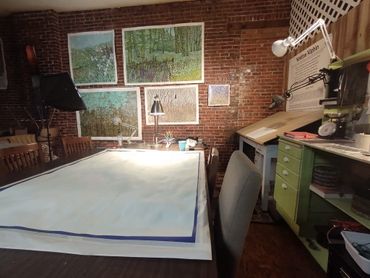 " Unlike the traditional art forms, my pigments and dyes are of primary colors. Secondary and tertiary colors are created as the primary layers mix on the paper. As an artists, I choose the shades of yellow or blue but the batik chooses the resulting green. This process may appear limiting but within those limitations are limitless possibilities. Often like life itself, the very process requires a give and take and a relinquishing to the results without an attachment to the outcome".